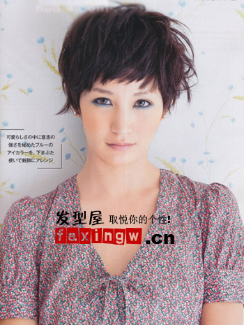 這款短髮清爽又嫵媚,充滿女人味。兩頰簡短的側發,發梢微微外翹,令本來簡潔的造型,年輕動感,年齡仿佛一下減小五六歲。額頭上的劉海,通過層次將雙眼映襯得明亮靈氣,紫藍色的眼影,使雙眼的電力大增。