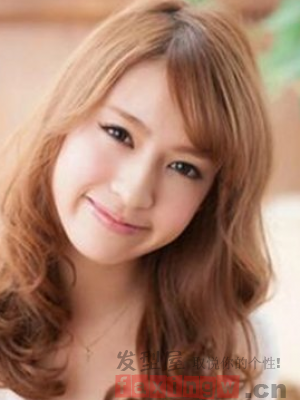 第一款是很適合小圓臉女生們的斜劉海的披肩燙髮髮型,棕色系的發色,白皙的甜美笑臉,時尚又減齡。