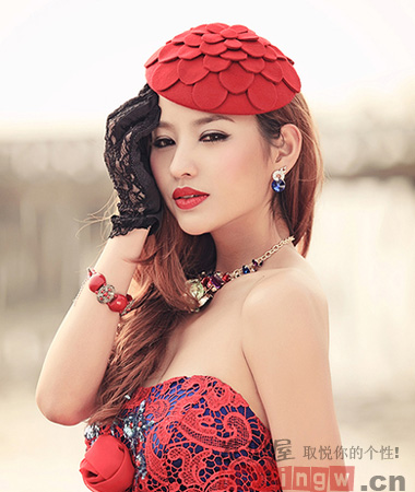 這款又是很對很多御姐女王范兒的大氣新娘的路線了,濃郁浪漫的古典朱紅色作為底色,搭配寶藍色,經典撞色帶來不一樣的視覺效果,側分的波浪長捲髮搭配抹胸禮服裙,性感火辣。
