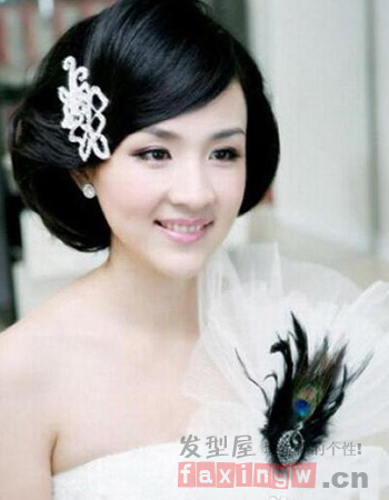 這種清新感十足的新娘盤發髮型雖然沒有上一款新娘長捲髮那浪漫,但優雅範可是十足的喔,沒有任何燙染的造型最顯新娘的清新單純感了,而偏分的劉海與低髮髻的盤發造型本周配合一個精緻的髮夾更顯新娘的純潔優雅感。