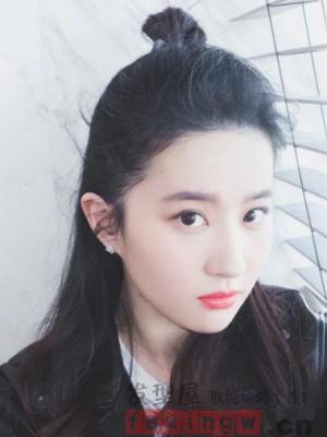 相比直發其實捲髮的丸子頭更時尚好看,細碎的髮絲不僅在一定程度上修飾了臉型,而且也突出了隨性的風格,搭配藍色大衣呈現出一個個性幹練的少女形象。