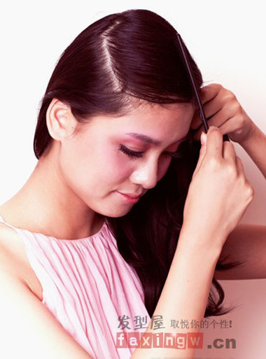 首先將頭髮進行斜分,分縫的位置大致是和嘴角-眼尾處三點一線的地方,劉海方向定為向左側斜分。分縫的工具一定要選用尖頭梳,能夠更準確、方便的操作。分縫以後要仔細檢查分的縫是否筆直,是否還存在雜亂的髮絲。