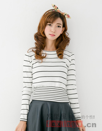 一款簡單的中長捲髮髮型因染上了時尚的發色與可愛的螺鏇捲髮就奶凸顯女生的甜美可愛感,而斜劉海的造型更是增添女生的溫柔氣質感,配合現在最流行的蝴蝶結髮飾造型會更添女生的可愛感喔。