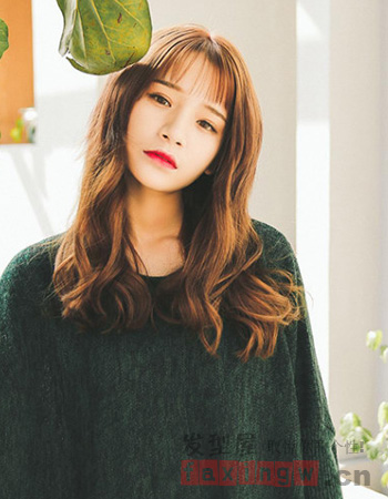 同樣是明亮而溫暖的橘黃色染髮顏色將女生的膚色襯托得更加白皙紅潤,而與可愛感的空氣感齊劉海髮型相搭,中長發燙髮設計更添活潑可愛少女風。