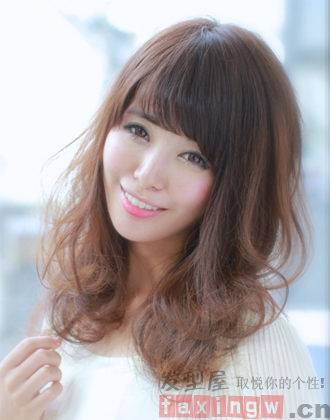 簡單的長捲髮髮型,搭配上輕盈的齊劉海,凸顯出精緻小巧的五官,展現出甜美靈動的樣子來,深色的頭髮也顯得清新自然。