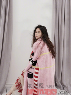 一身粉色系的長款大衣的穎兒,一頭深棕色系的披肩微卷長發髮型,白皙的臉蛋,盡顯十足慵懶少女風。