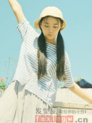 簡約的長髮雙馬尾扎發,搭配上無劉海的設計,凸顯出小巧的臉蛋,甜美十足,黑色的頭髮也顯得清新純美。