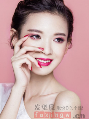 深咖色系的頭髮,簡單的打理成無劉海的盤發造型,白皙的精緻笑臉,搭配上斜肩上衣,時尚百搭顯氣質。