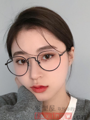 將長發全部扎向腦後,戴上那一份的清新氣息,側分劉海的造型帶著一點的修顏效果,女生帶上一副眼鏡更顯幾分的清新淡雅氣息,很容易讓人有著更多的好感!