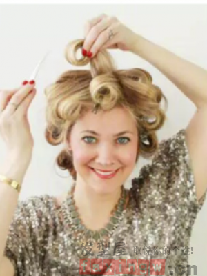 第四步:根據上一步的操作,將剩下的頭髮全部都燙成發圈用髮夾固定好。