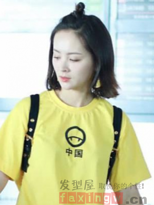 譚松韻的可愛小圓臉在這一款髮型的搭配下也是十分的顯可愛呢,齊頸短髮上的那一份蓬鬆自然,在頭頂紮上一個小小的蘋果頭,微微留出一份的空氣劉海,都在顯示著這一份的甜美可愛感!