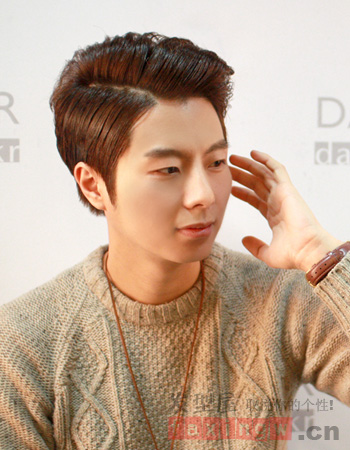 一款很有歐巴風範的韓式男生髮型,發色是低調卻不失時尚的栗色,而偏分的髮型設計更是凸顯男生的成熟穩重的氣息,配合露額的造型更顯清爽與歐巴的獨特魅力。