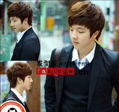 2、頭頂蓬鬆的層次感髮絲,額頭弧度的細碎平劉海,配上亞麻色+栗色的染髮,潮味十足,一身正統的衣著搭配很有職場男士的味道,時尚潮流的職場男士可以試試喔。