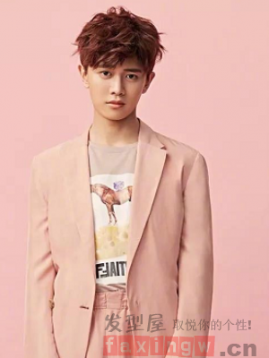 一款簡單的短髮燙髮總是有著屬於夏天的清爽氣息,上梳的劉海更是露出整個光潔的額頭更加的清爽帥氣,一身白色的體恤衫更是散發著青春的陽光氣息,呈現出一個陽光大男孩的模樣。