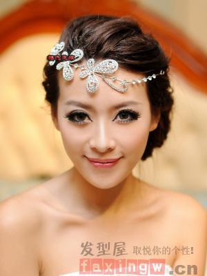 NO.2:無劉海盤發的造型,在後面設計個盤發,將前面部分的頭髮全部梳到後面,弄出高聳蓬鬆的感覺,在額頭別上一個簡單的銀色頭飾,這樣會讓你更顯清新氣質。