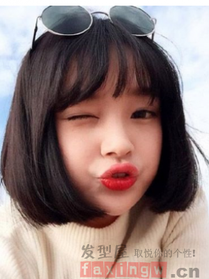 一身淺色系的上衣,搭配上一款深棕色系的齊劉海的短髮內扣髮型,白皙的臉蛋,修顏減齡又不失可愛俏皮。