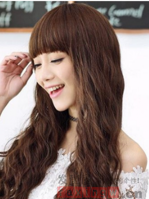 長頭髮如何設計更顯時尚氣質呢?這是一款個性染髮的齊劉海的波浪卷的燙髮長發髮型,白皙的笑臉,時尚個性更吸睛。