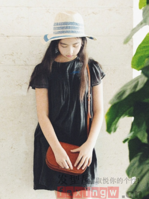 長長的自然卷從肩部自然落於胸前,配上一頂藍白相間的帽子,身穿黑色的連衣裙。簡單的搭配,卻有夏日裡清風陽光的味道,適合喜歡旅行的小夥伴們。