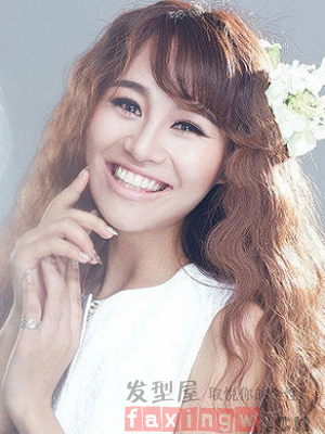 大面積的捲髮燙髮髮型,才用滿滿的s捲髮的時尚浪漫去打造溫柔女子氣息,可愛的空氣劉海配上潔白的花朵,如畫中走出的仙子一般,清新可人笑容下盡顯溫柔。