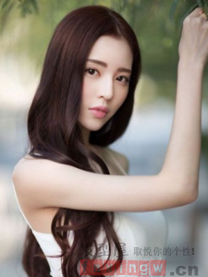 長髮捲發燙髮髮型梳成中分的模樣,彰顯五官的立體感展現女子的清新自然的一面,時尚的中分也是自信女神的代言方式,浪漫的捲髮透露出小女人的味道。