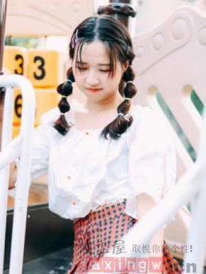 中分長發上紮起兩個簡單好看的雙馬尾辮,那多根皮筋組成的泡泡馬尾辮更加的嬌俏可愛,留下些許的碎發劉海更顯清新甜美,帶著一點的嬰兒肥的小臉更加讓人喜愛。