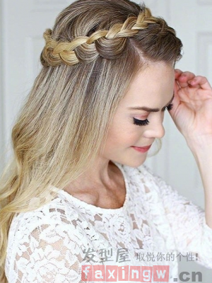 簡單大方的一款編髮髮型,側分劉海簡單的編起一根麻花辮髮型,當做花環一樣盤在頭上時,那柔順的長髮簡單的散落在肩頭,感受著更多一份的甜美溫柔感!