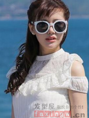 一款純白系露肩連衣裙在秋季儘管看起來有些絲絲的涼意,搭配一款斜劉海女生半扎發髮型,可以緩解整體髮型的凌亂氣息,更顯的淑女,時尚的墨鏡搭配其中,更是滿滿的回頭率。